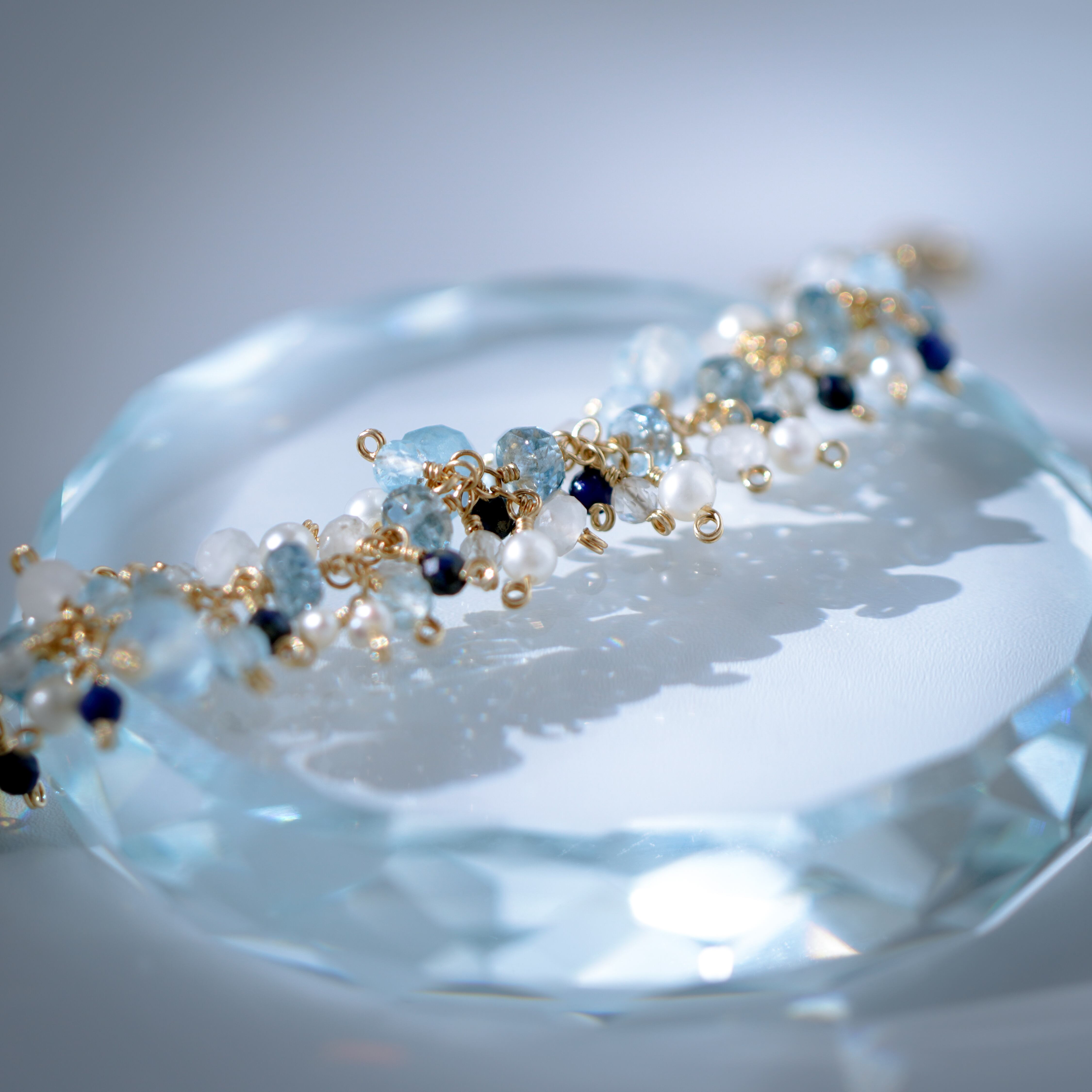 [ Materials ] 14kgf、アクアマリン(サンタマリアカラー)、アクアマリン、ジルコン、スカイブルートパーズ、ラピズラズリ、ローズクォーツ、淡水パール