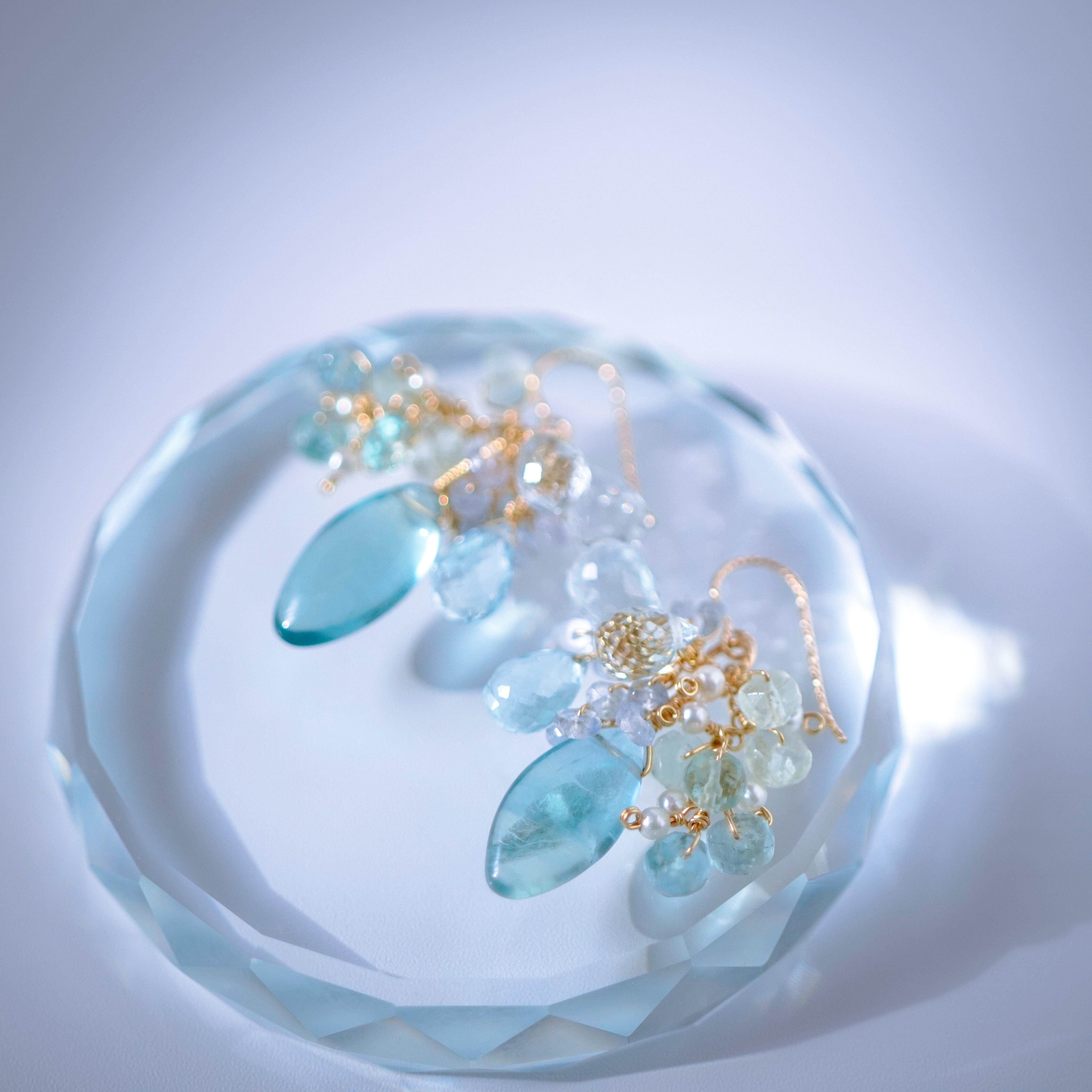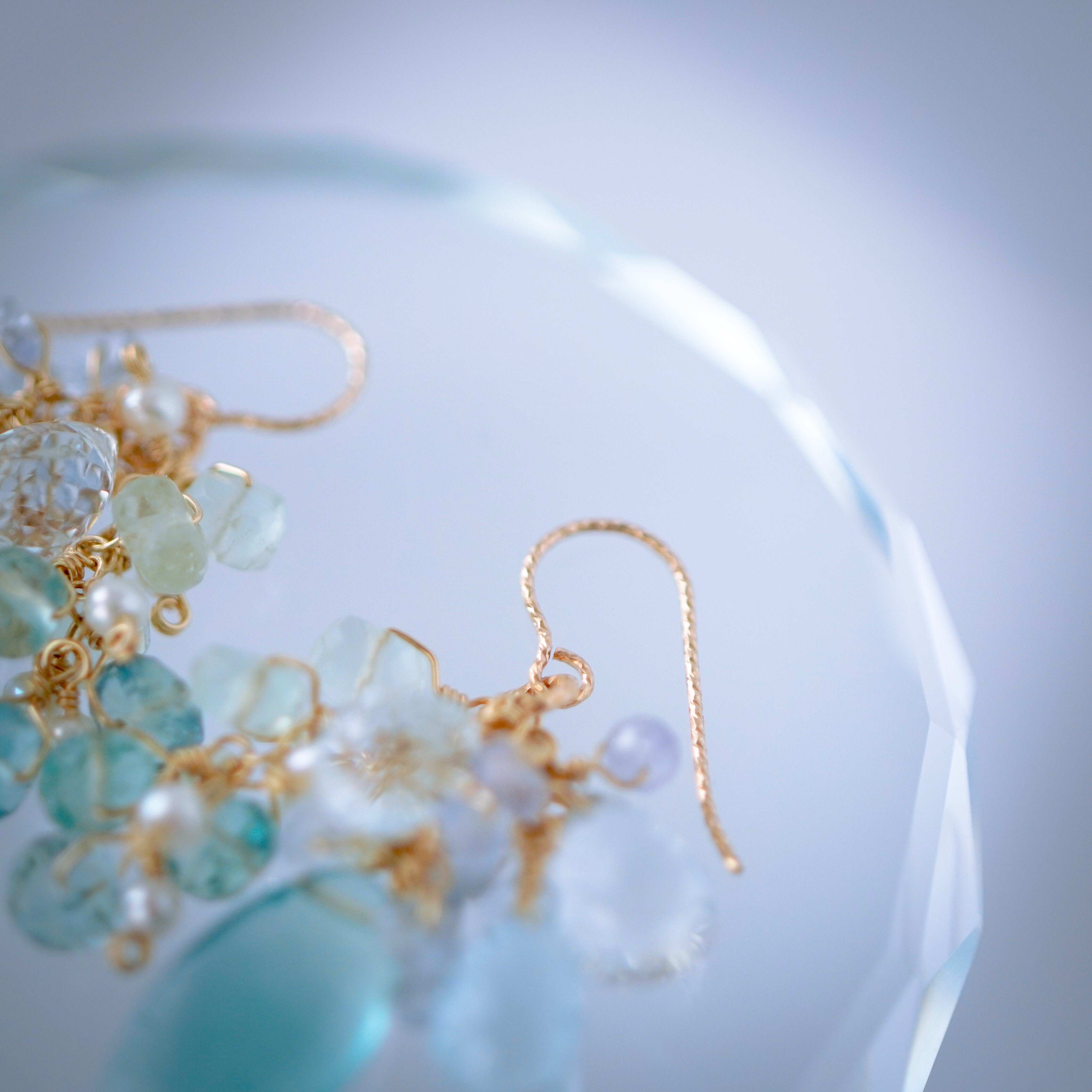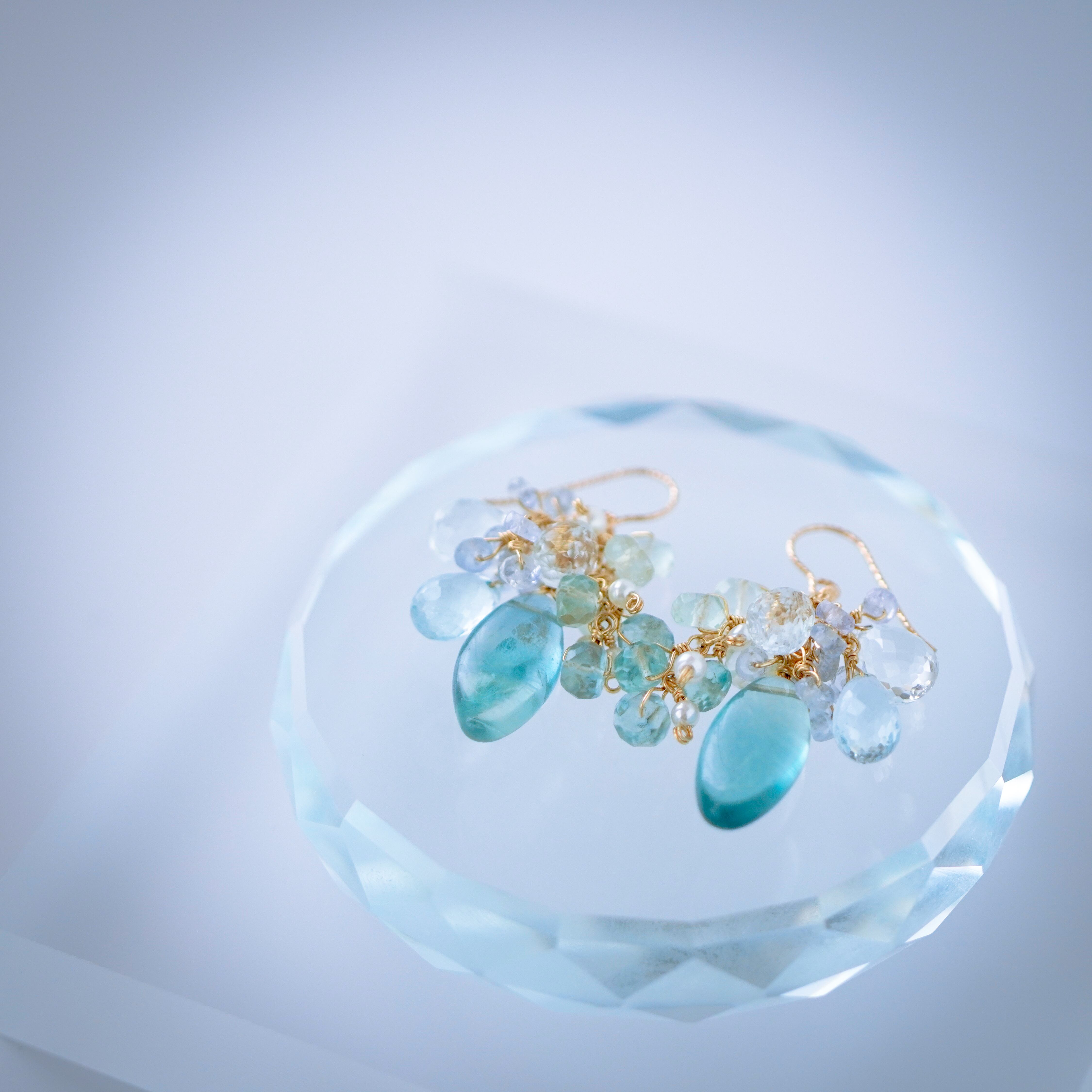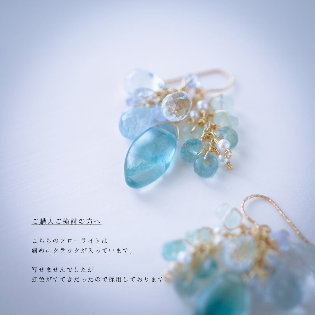 [ Materials ] 14kgf、フローライト、アクアマリン、セイロンサファイア、淡水パール(イヤリング金具:ニッケルフリー、シリコン)