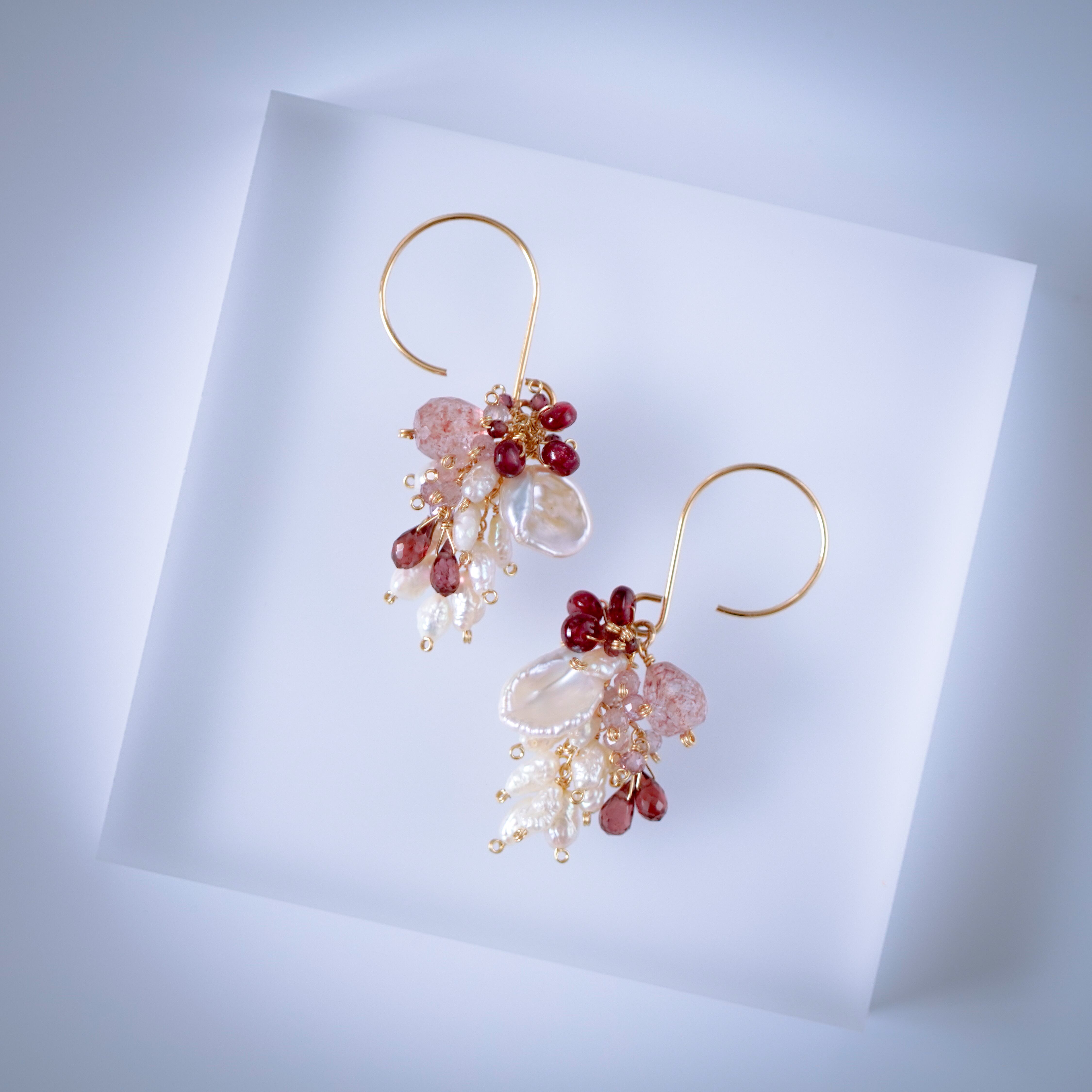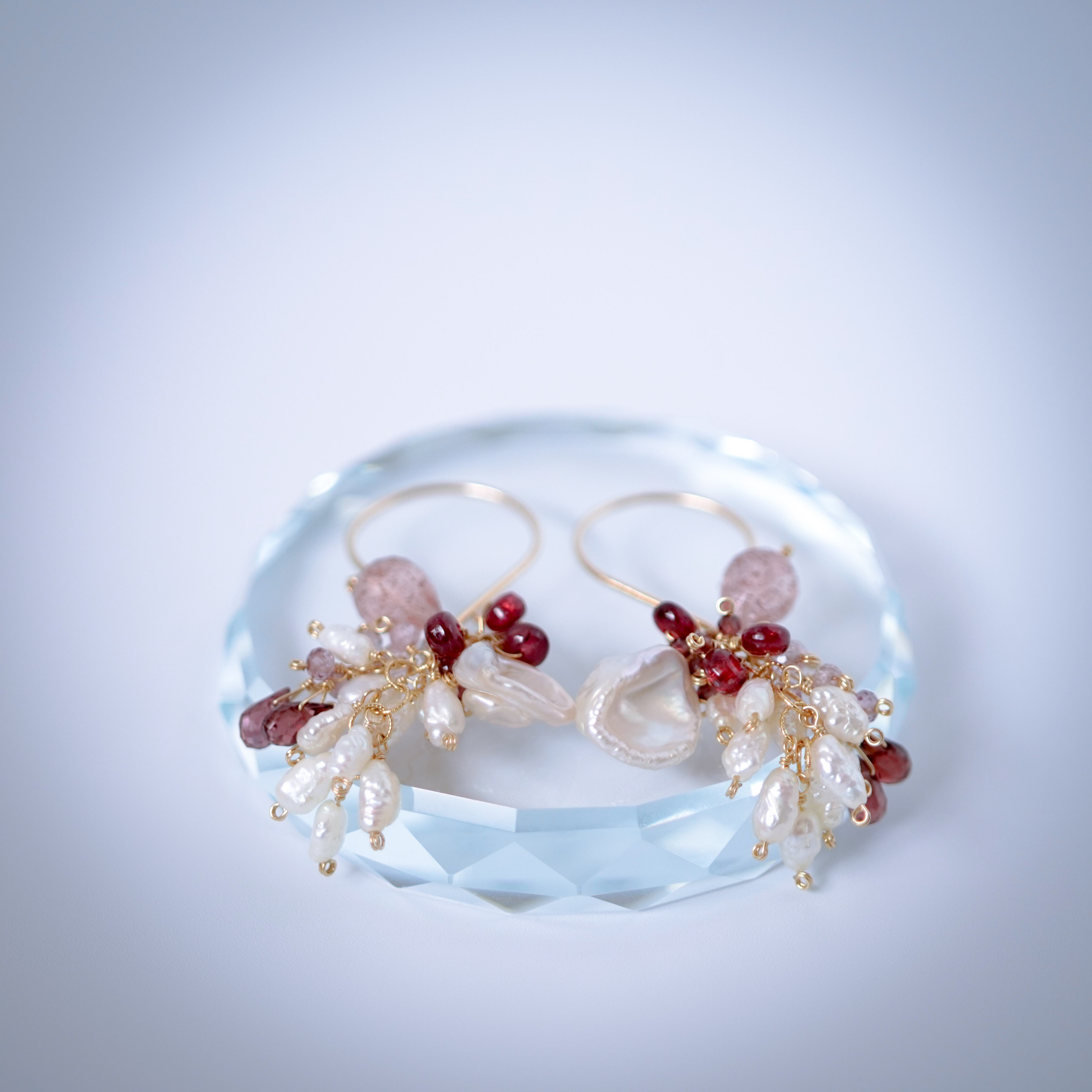 [ Materials ] 14kgf、レッドスピネル、スピネル、ストロベリークォーツ、モザンビークガーネット、ロードライトガーネット、淡水パール(イヤリング金具:ニッケルフリー、シリコン)